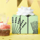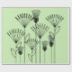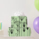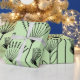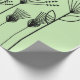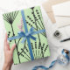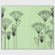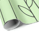 This wrapping paper has a mid-century modern design of plants made from lines, circles, triangles, rectangles, and squares in black on a green backgrounds.