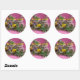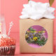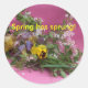 sticker,large 3-inch,pink with spring flowers in yellow,blue,white and yellow letters: "Spring has sprung!"