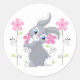 This round sticker is shown in white with a cute bunny and pink flowers print.
