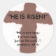 sticker, white background with brown torn-paper cross and black lettering: 'HE IS RISEN!" ,,,"He is not here; He has risen,just as He said...". Matthew 28:6