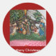 Round Christmas sticker, red background, with Nativity photo and the words: Merry Christmas