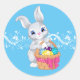 This round sticker is shown in a festive Easter Bunny with eggs print in a lovely sky blue colour.