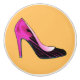 Pop art rendering of the beloved stiletto pump in hot pink and black on a soft orange background