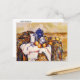 A postcard featuring the fine art watercolor, Still Life with Blue Pot, by French Post-Impressionist artist Paul Cézanne (1839-1906), circa 1900. This still life depicts a deep blue teapot on a patterned tablecloth, accompanied by fruit.
