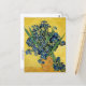 A fine art postcard with the post-impressionist painting titled Still life with Irises (1890), by the Dutch artist Vincent Van Gogh (1853-1890). A still life with a bouquet of blue-violet iris in a clay jar against a golden background.
