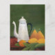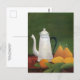 A fine art postcard with the painting in the Naïve or Primitive manner by Henri Rousseau (1844-1910), Still Life with Teapot and Fruit (1910). A white teapot with pears, oranges and lemons on a table with a dark green background. He was ridiculed during his lifetime but later recognised for his paintings. Rousseau was a self-taught French artist.