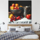 This is an AI generated still life painting with a silver bowl of fruits and a silver pitcher.