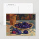 A fine art postcard with the painting by Theo van Rysselberghe (1862-1926), Still Life with Plums (1926). A Belgian Neo-Impressionist painter. A bowl full of purple plums on a table.