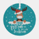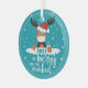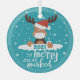Celebrate and commemorate this pandemic 2021 Christmas with this fun ornament with a lovely cartoon reindeer with a red hat, face mask, and hand sanitizer, decorated with snowflakes. The caption reads "still merry and still masked".