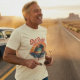 Printed on a Natural cotton base for an authentic vintage feel, the design features bold retro script, a stylized vinyl record rising over a glowing horizon, and the signature line: The Music Never Gets Old.