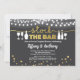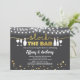 Elegant gold invitation with string light design on charcoal grey chalkboard background. Classy, chic and glamourous.