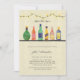 Stock the bar wedding shower invitations features watercolor liquor and wine bottles on a shelf with hanging string lights above and festive bottle pattern on the back. (original art by Shelley Winters Design)