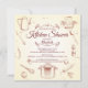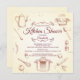 Stock The Kitchen Bridal Shower Invitation featuring sketched kitchen tools including a pot, whisk, rolling pin, spatula, pepper mill, colander & wooden spoon & coffee pot set on a creamy tan background. Flip or stock the kitchen bridal shower over to view a matching back for an extra special touch.