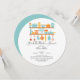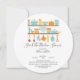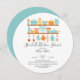 Modern stock the kitchen bridal shower invitation featuring blue & orange kitchen tools set on a contemporary white background with a coordinating blue background. Visit our shop to view matching kitchen shower invitations.