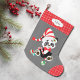 A black and white panda bear wears a red and white stocking cap and holds a candy cane on the front of this cute stocking. A few red, blue, and green tree bulbs lie scattered about the bear. He wears a red polkadot bow tie, which matches the toe and top border. On the top border is a white label with your custom text, which matches the background colour of grey. The back of the stocking has the same polkadot pattern. Cute for either a boy or girl!