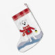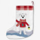 A red and white Christmas stocking with a cartoon polar bear holding a light in one hand and waving with the other . It also has a trompe l'oeil plaid border . Personalise it with a name .