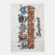 The icons and landmarks of the borough of Stockport, in Greater Manchester, England, featuring a stylized cartoon character versions of its townscape, including (from left to right) Stockport Town Hall, Stockport Viaduct, Stockport Plaza, the number 192 bus to Hazel Grove complete with a Stockport hat, and Stockport Pyramid. Stockport is spelled out in traditional red brick and sandstone, with cotton flower embellishment.