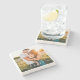 Personalised single square photo template and love script text on a stone table drink coaster.