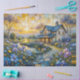 of pink, purple and blue flowers along a pretty flowing stream, with a patchwork sky