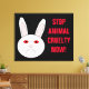 This canvas print features the sad face of a white rabbit. This rabbit has a big frown on its face because it is a lab rabbit that has had cosmetics tested on it. The whites of its eyes are red and swollen. The design has been created to bring to attention the unnecessary suffering caused by the testing of cosmetics on animals. The bold red text reads "Stop animal cruelty now!"