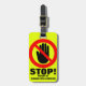 Help find and keep others off your luggage bag with this bold lime green, red and black named STOP! hands off warning symbol luggage tag. Unisex design great for the whole family. Reads STOP property of and then add your name on front and full name and address on reverse. Perfect for airport holidays and coach trips. Customise the reverse of this tag with your name and address details. Designed exclusively by Sarah Trett.
