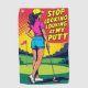 This vibrant pop art image humorously depicts a female golfer on a putting green, with the bold and cheeky caption "Stop Looking at My Putt." The artwork features bright colours and dynamic comic-style graphics, capturing a playful and confident moment in a stylised golfing scene.