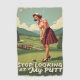 This vintage-style illustration features a stylishly dressed woman on a golf course with the humourous text, "Stop Looking at My Putt." The poster combines retro aesthetics with a playful twist on golf culture, capturing the viewer’s attention with its clever wordplay and classic design elements.