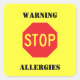 Square high-visibility sticker that reads "Warning - STOP - Allergies" Text may be changed to words of your choice for free