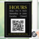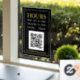 Store Hours Open Sign with QR code for store entry door or window in white and yellow text on black background with QR code message.