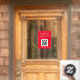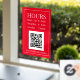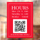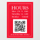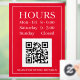 Store Hours Open Sign with QR code for store entry door or window in white text on red background with QR code message.
