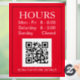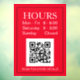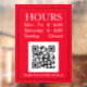 Store Hours Open Sign with QR code for store entry door or window in white text on red background with QR code message.