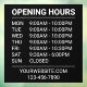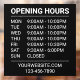 Display your schedule clearly with this simple, professional opening hours window cling featuring crisp white text on a bold black background in a convenient 12"x12" size. Designed for small business use, this minimalist layout keeps information easy to read while maintaining a clean, modern look. Add your opening hours, plus extra details like your website, phone number, or special messages at the bottom. Ideal for storefront window decals and everyday business signs, all text can be fully changed to match your needs.