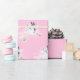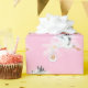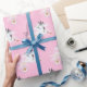 Stork flying in clouds with baby in a blanket on pink background for baby girl gift