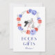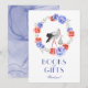 A table sign for your baby shower that evokes the peace and tranquillity of winter! The stork is surrounded by a wreath of blue and red peonies. Matching items available.