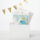 A cute white stork carries a baby in a blue bundle through the sky, perfect for boy baby shower party favour bags. MATCHING invitations, plates, napkins, stickers and more.