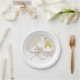 Neutral baby shower paper plates featuring an illustration of a stork in the clouds with a yellow bundle.