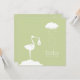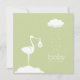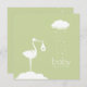Customisable gender neutral Baby Shower invitation template for baby girl, boy or twins featuring a cute illustration of a stork delivering a baby and raining little hearts on green (colour can be changed).