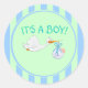 This cute design features a flying stork and a baby boy. The background is striped along with solid colours of light blue and light green.