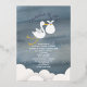 Illustration of a stork carrying a white bundle surrounded by stars with clouds at bottom over watercolor inspired blue background.