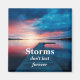 Magnet with an encouraging saying saying: Storms don't last forever. A gorgeous photograph. A scenic spot. A nice calm lake with a wooden dock stretching outwards. Setting sun provides beautiful colours in the sky, vibrant red and blue.