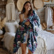 A dreamy fall rose pattern, with ethereal moons and big burgundy blooms floating in a rainy sky on a dark blue background.