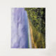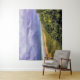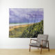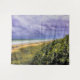 This Wall Tapestry features an original photograph by ZoeSPEAK, of Jupiter Beach on a stormy day. The land and seascape is a long view of the sand and ocean from the high dunes covered in sea grape bushes. The lavender blue grey sky is filled with threatening but beautiful dark clouds. In the distance, there is a pier extending into the water.