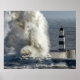 An amazing photograph by the photographer Dave Fletcher of the stormy seas with huge waves covering the pier and taller than the lighthouse at Roker a seaside town in the North East of England