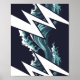 A bold graphic design featuring powerful ocean waves in shades of teal, turquoise, and deep blue, contrasted by sharp white lightning bolts cutting across a dark navy background. The dynamic composition combines the fluid motion of crashing waves with the jagged intensity of lightning, creating a dramatic and energetic visual that captures the raw force of nature.