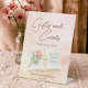 Make it easy for your bridal shower guests to know where to put their gifts and cards with this simple yet beautiful tabletop sign. The blush pink and peach watercolor design features elegant script lettering along with an image of a book with a pink rose and an engagement ring balanced in its open pages, and the caption "A new chapter begins".