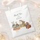 The front of the bag showcases a captivating scene with forest animals, including a gentle deer, two bunnies engrossed in a book, a clever fox, a playful squirrel, and a classic baby carriage at the centre. The detailed illustration and nostalgic colour palette bring the enchanting world of a storybook forest to life, creating a delightful backdrop for your baby shower favours.