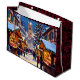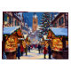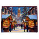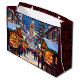 A Christmas gift bag with a cartoon depiction of the Strasbourg, France Christmas market depicting shopping booths and people walking around on a snowy winter day.