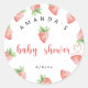 Cute baby shower invitation card featuring watercolor illustration of strawberries. The text says "berry much for coming" Matching items available.