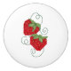 Two red strawberries cross-stitched with green leaves and tendrils. Yellow-gold seed beads decorate the strawberries. This is a photo of the cross-stitch.