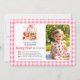 Basket with strawberries, hearts and pink bow Berry First Birthday photo invitation. Announce your little one's "Berry First Birthday" in the most charming way with this delightful photo invitation! This sweet design features an overflowing basket of vibrant red strawberries, accented by whimsical hearts and a delicate pink bow tied to the handle. The playful "Berry First Birthday" text is artfully integrated below, while a cherished photo of your baby takes centre stage on the right. All these elements are beautifully framed within a crisp white border, highlighted by a subtle pink line and bordered by classic red gingham, creating a wholesome, picnic-perfect aesthetic. The reverse side continues the charming theme with a full coverage of the coordinating red gingham pattern.